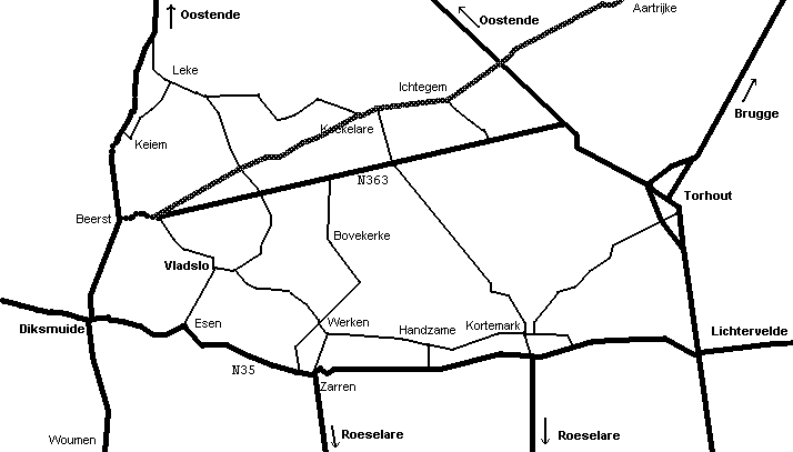 Deze weg loopt via Koekelare, Ichtegem,Aartrijke en langs Zedelgem tot in Brugge.